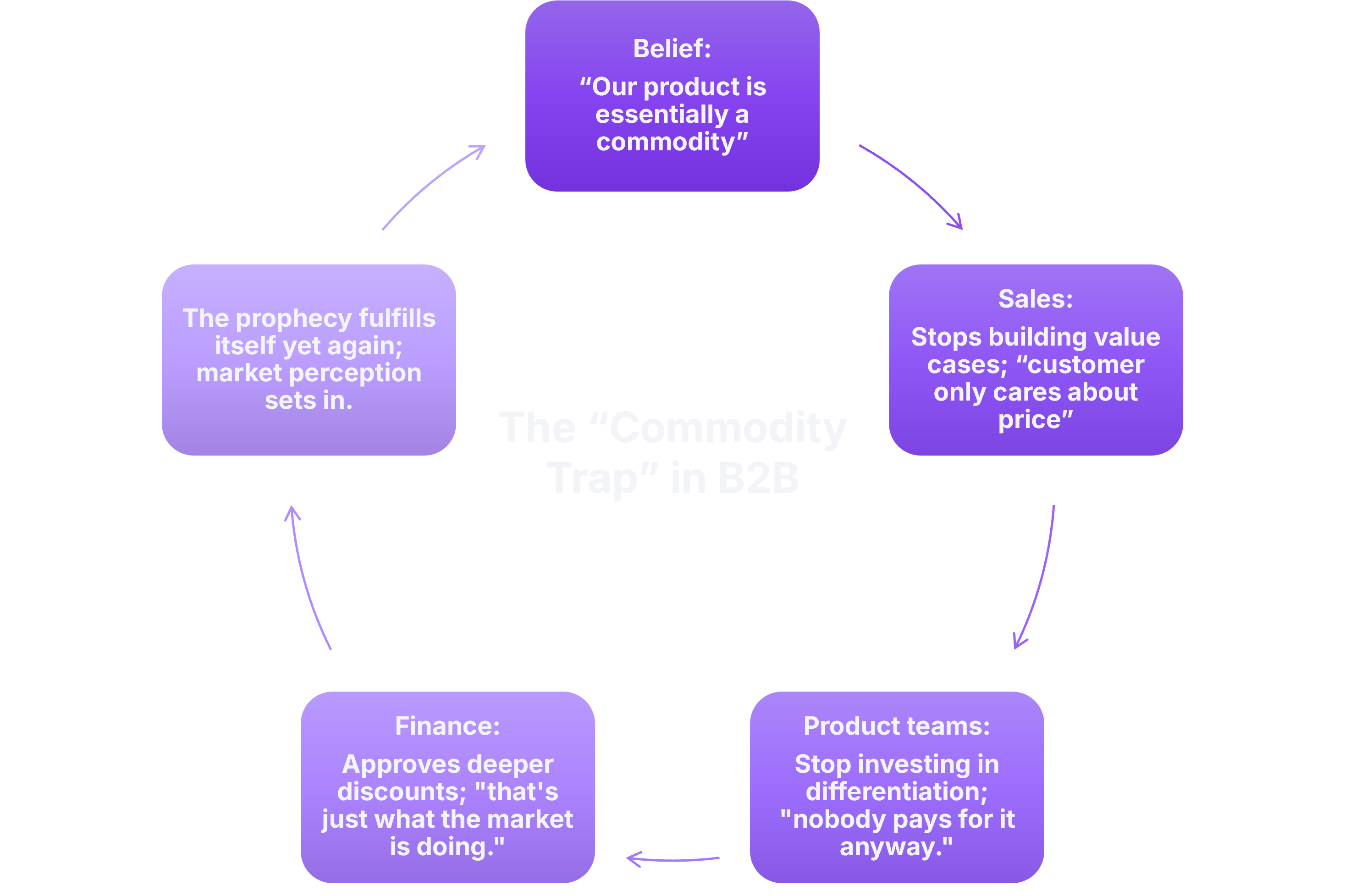 That's the mechanism. Commodity thinking isn't a description of your market; it's a posture toward it. And once the posture sets in, it quietly shapes a thousand small decisions. Sales reps stop building value cases because "the customer only cares about price." Product teams stop investing in differentiation because "nobody pays for it anyway." Finance approves deeper discounts because "that's just what the market is doing." The prophecy fulfills itself, one surrendered basis point at a time.