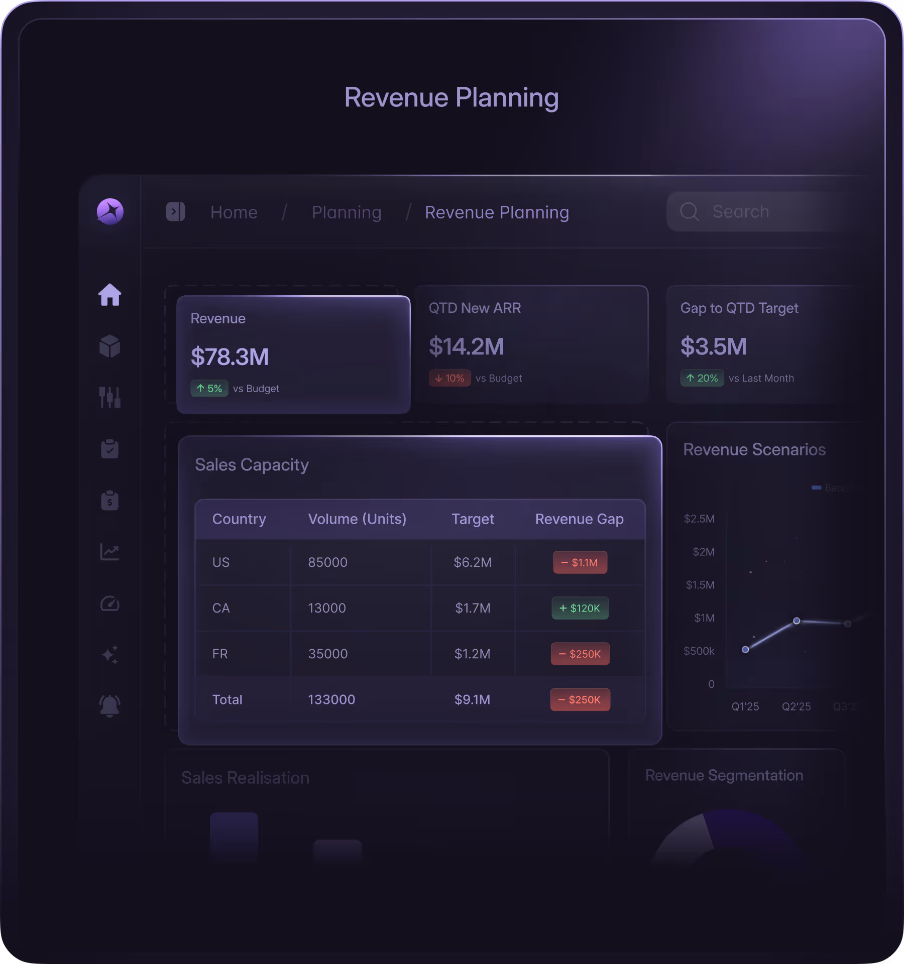 Everyone works from the same live forecast. Finance sees the numbers, pricing sees the levers, and sales sees the targets—so all decisions move toward shared revenue and margin goals.